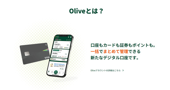 Oliveは銀行口座、カード決済、ファイナンス、オンライン証券、オンライン保険などをアプリ上でシームレスに組み合わせたサービス。従来の銀行店舗での取り引きを前提としたサービスではなく、モバイルアプリ上の取り引きを前提としている。