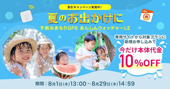 KDDIは8月29日午後2時59分まで、小型GPS端末「あんしんウォッチャーLE」の本体代金を10%引きする「夏のおでかけキャンペーン」を実施する。