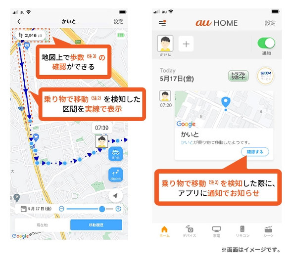 本サービスでは、8月1日に機能のアップデートを実施し、電車やバスなどの乗り物に乗っていることを検知した時にアプリに通知が届く「乗り物通知機能」と、歩いて移動した時の歩数が分かる「歩数表示機能」が実装された。また、精度の低い基地局での測位情報の補正を実行することで、位置情報の精度を改善している。