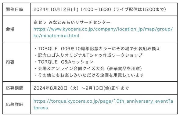 何らかの発表があるのでは? と期待する人は「京セラ みなとみらいリサーチセンター」で10月12日開催の「スペシャルイベント」に期待してほしい。京セラはニュースリリースで、TORQUE G06の外装をオリーブグリーンに組み換えられるなどの企画を実施すると明らかにしている。