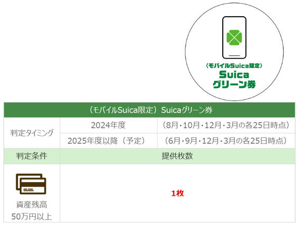 50万円以上の資産残高があれば、「モバイルSuica限定のSuicaグリーン券」も獲得できる。Suicaグリーン券は湘南新宿ラインや東海道線、横須賀・総武線快速などの普通列車のグリーン車を利用できるチケット。50kmまでが750円、100kmまでが1000円、101km以上が1550円になる。