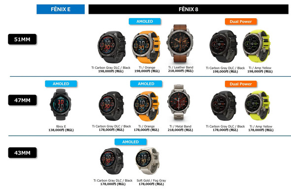 「fenix 8 Sapphire AMOLED」シリーズは3サイズ/8モデルで展開し、価格は17万8000〜21万8000円(税込み、以下同)。「fenix 8 Sapphire Dual Power」シリーズは2サイズ/4モデルで展開し、価格は17万8000〜19万8000円で10月中旬発売予定。「fenix E」は1モデルで価格は13万8000円、9月中旬に発売予定。