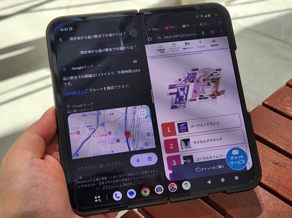 Geminiは1画面のPixel 9/Pixel 9 Pro/Pixel 9 Pro XLでも利用しやすい。しかし、Pixel 9 Pro Foldで使うと「やっぱり大画面でこそ見やすい」と感じたシーンがあった。例えば、TV番組に出演しているタレントがロケで訪れた場所の名を発言したとする。ただ、番組名には地名がなく、TVの画面に地図や場所の詳細が出るわけでもない。そんな時、Pixel 9 Pro Foldを開いてGeminiを起動して「これ(場所の名)ってどこにあるの?」と聞くと、即座に回答を示してくれる。しかも地図付きでだ。