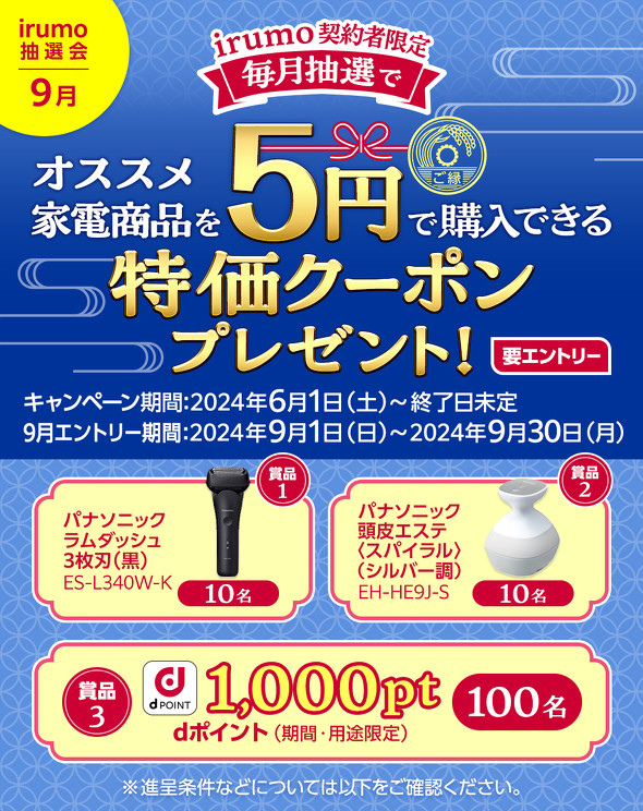 期間中にキャンペーンサイトからエントリーし、毎月の契約判定機準備までにirumoを契約しているユーザーが対象。抽選で家電やdポイントを進呈、付与する。9月の内容は以下の通り。