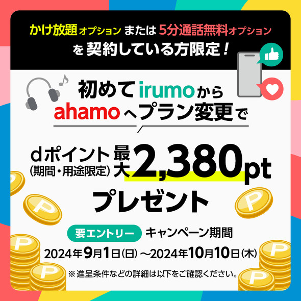 期間中にキャンペーンサイトからエントリーし、irumoと「かけ放題オプション」か「5分通話無料オプション」契約ユーザーがahamoへプラン変更した場合1400ポイント、同時に「大盛り」オプションを申し込んだ場合2380ポイントのdポイントを付与する。