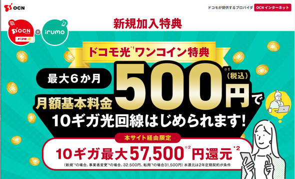 期間中にドコモ契約者がキャンペーンサイトのフォームか電話で「ドコモ光 1ギガ/10ギガ(2年定期契約)」とプロバイダー「OCN インターネット」を同時に新規/事業者変更/転用のいずれかで申し込んだ上、申込月から起算して4カ月以内に利用開始し、利用開始した2カ月後の月末時点で契約中であるユーザーが対象。利用開始月の3カ月後の月末頃にOCNから配信するメールから手続きした場合、以下の通り現金を還元する。