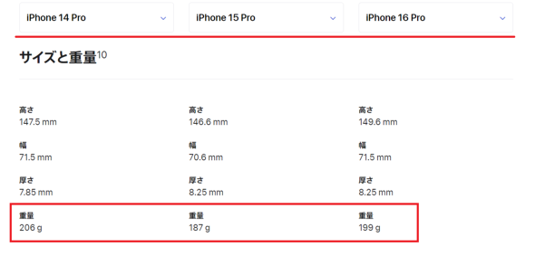 米Appleが9月9日(米国時間)に「iPhone 16 Pro」シリーズを発表しましたが、公開された仕様を眺めていて気付いてしまいました。本体重量が増えています。