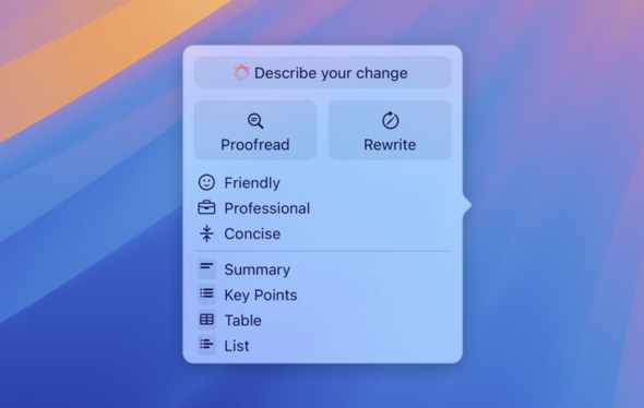 メールやメモ、Pages、サードパーティー製アプリなど、文字を入力するさまざまな場面で、Apple Intelligenceによる「文章のリライト、校正、要約」を使えるようになる。