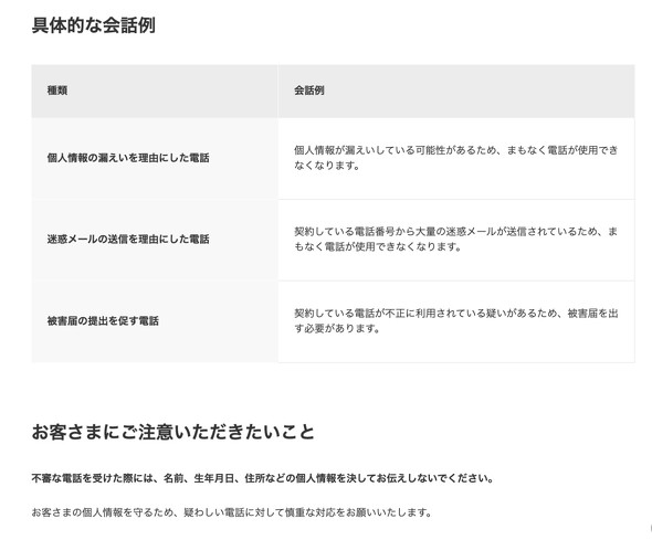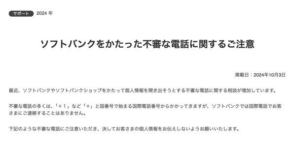 ソフトバンクは10月3日から、自社のWebサイトで不審な電話について注意喚起を行っている。