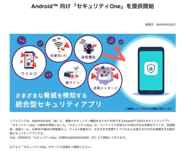 セキュリティOneは、迷惑電話、迷惑メール、ワンクリック詐欺などの恐れがある危険なサイト、公衆Wi-Fi経由の情報漏えい、ウィルス被害など、さまざまな危険やトラブルからユーザーの情報を守る統合型セキュリティアプリ。iOS向けには2023年6月29日から、Android向けには9月22日から配信されている。