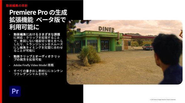 また、βアプリではFirefly Video Modelを活用した「生成拡張」が新たに実装される。これは動画クリップを最大2秒、オーディオクリップを最大10秒“引き延ばす”機能で、動画と音声の編集タイミング合わせをしやすくするための機能となる。この機能を使って書き出された動画には、C2PA形式の来歴も記録される。