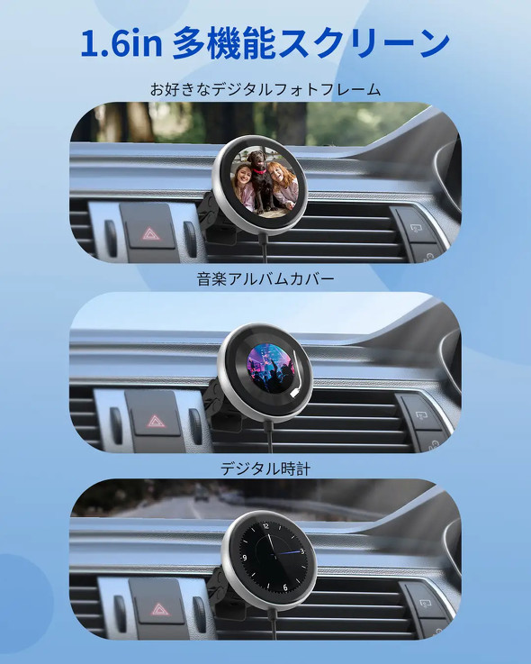 本体に世界初をうたう1.6型の丸型モニターを搭載し、時計表示、プレイ中の音楽アルバム表示、写真アルバム表示機能を利用可能。USB Type-C変換アダプターの他、横型や縦型などのエアコン吹き出し口に装着するためのパーツが付属する。USB Type-C変換アダプターの他、横型や縦型などのエアコン吹き出し口に装着するためのパーツが付属する