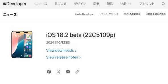 米Appleは10月23日(現地時間)、iOS 18.2、iPadOS 18.2、macOS Sequoia 15.2を含む主要OSの最新開発者向けβ版を公開した。iOSではこのバージョンで、WWDCで発表された多数の「Apple Intelligence」機能が試せるようになる。ChatGPT統合、Genmoji、Image Playground、Image Wand、Visual Intelligenceなどだ。