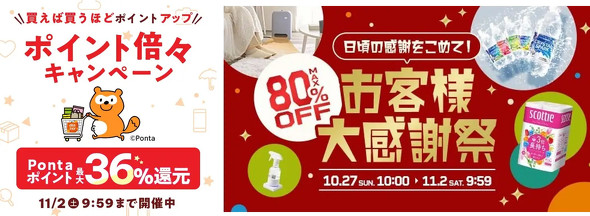 また、アイリスプラザ、暮らし健康ネット館、pet館、収納宅配館、食福堂 au PAY マーケット店など計7店舗で「お客様大感謝祭」を実施。対象商品が最大80%割引になるアウトレットセールや、最大20%のポイント還元をはじめ割引クーポンを提供する。還元するPontaポイントは、いずれもau PAY マーケット限定。