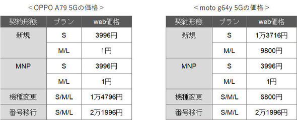 とにかく安い機種が欲しい人は、MNPなら一括1円のmoto g64y 5GとOPPO A79 5Gがオススメです。この2機種は機種変更でも6800円〜1万4796円で購入できます。