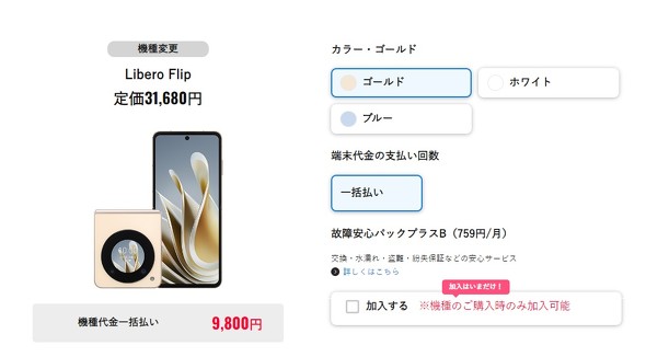 また、折りたたみスマホの「Libero Flip」は最安9800円です。新規契約/MNPだけでなく、機種変更でも9800円で販売されています。以前はメルマガ会員やマイページにバナーが表示された人のみでしたが、現在は誰でも9800円で機種変更できるようになりました。