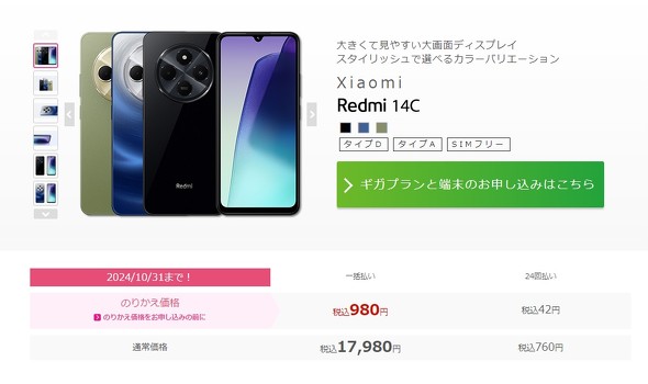 MNPならIIJmioもスマホがお得に購入できます。現在実施中の「スマホ大特価セール」では、タイミングによってはMNPにて一括110円で購入できる機種もあります。11月は、MNP特価として「iPhone SE(第2世代)」の64GBが7980円、「moto g64 5G」が1万4800円などで販売されています。10月17日に発売されたRedmi 14CもMNPなら一括980円と安いです。