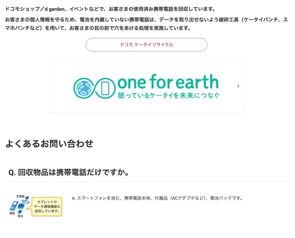 NTTドコモの「携帯電話の回収に関するよくあるお問い合わせ」というページには、「回収物品は携帯電話だけですか」という問いに対し、「スマートフォンを含む、携帯電話本体、付属品(ACアダプターなど)、電池パックです」とだけ記載がある。