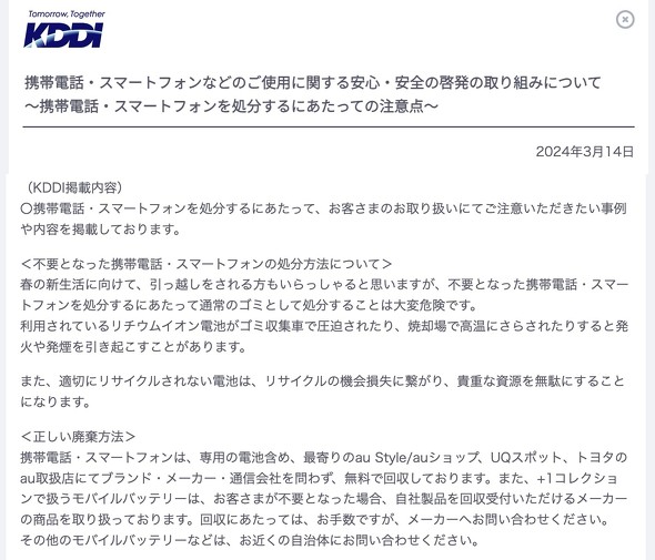 各社ともにおおむね同じような文言で、回収の対象があくまでも携帯電話とそれに付属するバッテリー、充電器だと示している。ここでいう携帯電話はフィーチャーフォン(日本ではガラケーとやゆされるもの)とスマートフォンだ。