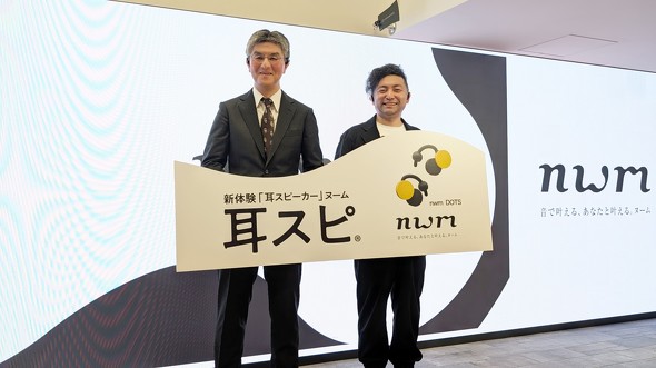 nwmは没入ではなく“共存(Co-being)”をコンセプトとするNTTグループ初の音響ブランド。オープンイヤー型ながらも音漏れを抑制する技術を活用し、耳をふさがずに音楽を視聴したり、オンライン会議で相手の声を聴いたりできるのが大きな売りだ。2モデルの特徴や市場に投入する狙いは何か。NTTソノリティの坂井博社長と、クリエイティブディレクターの竹内慎太郎氏が語った。