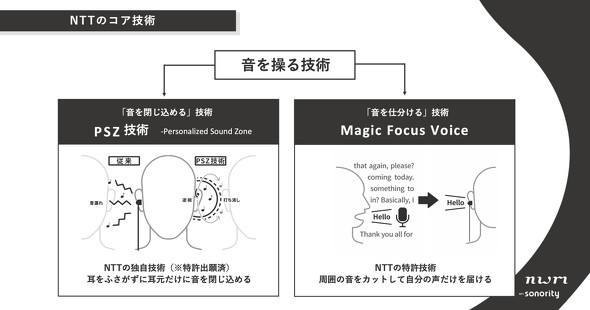 nwm DOTSはある音波(正相)に対し、180度位相を反転させた波形(逆位相)を重ねることで、音が消える原理を応用した「パーソナライズドサウンドゾーン(PSZ)」技術に加え、音が2つのマイクに到達する時間差から音響空間を認識して話者を特定するビームフォーミング、雑音を除去して音声だけを抽出するスペクトルフィルターを応用した「Magic Focus Voice」という技術を搭載したイヤフォンだ。