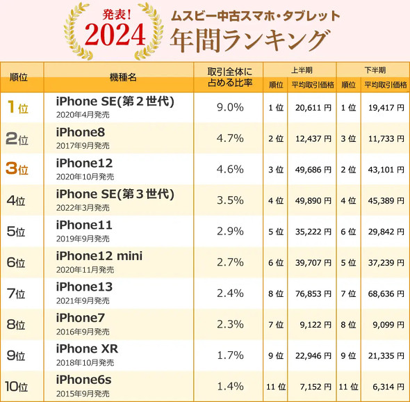 ウェイブダッシュは、12月26日に同社が運営するフリーマーケットサイト「ムスビー」内で2024年の中古スマホ/タブレット年間取り引き数ランキングを発表した。2024年に取り引きのあった全730機種を対象としている。