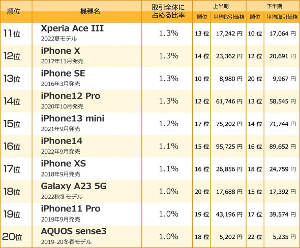 トップ10はiPhoneシリーズが独占したが、11位以下には「Xperia Ace III」「Galaxy A23 5G」「AQUOS sense3」もランクインしている。