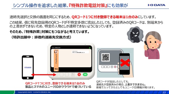 本体に出てくる二次元コードを読み取らないとスマートフォンをひも付けできない設計なので、特殊詐欺対策には強い……のだが、見守る側がスマホを機種変更した場合は、設置先まで出向かないといけないという点が欠点となる