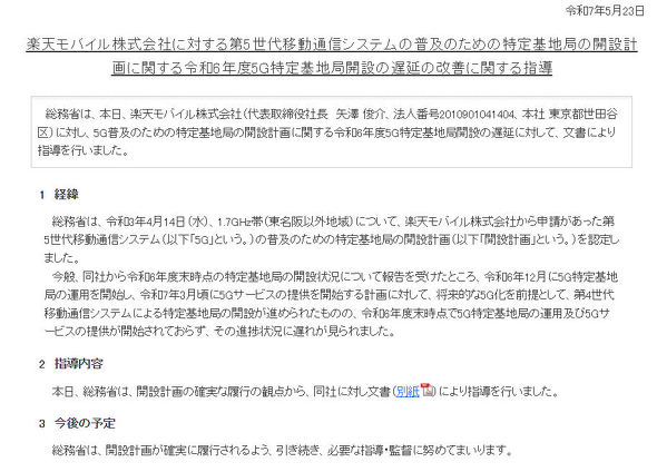 総務省が5月23日、楽天モバイルの5G基地局開設が遅延しているとして、行政指導を行った。