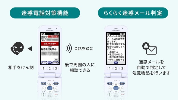 昨今増えている、迷惑電話や迷惑メールを検知する機能も備えている。電話帳に登録されていない番号から電話がかかってくると、発信者側に通話を録音する旨のメッセージをガイダンスで伝える。迷惑メールを判別する「らくらく迷惑メール判定」では、口座振り込みを促すなどの怪しいメールに返信したり、記載のURLにアクセししたりしようとすると、注意を促すメッセージを表示する。