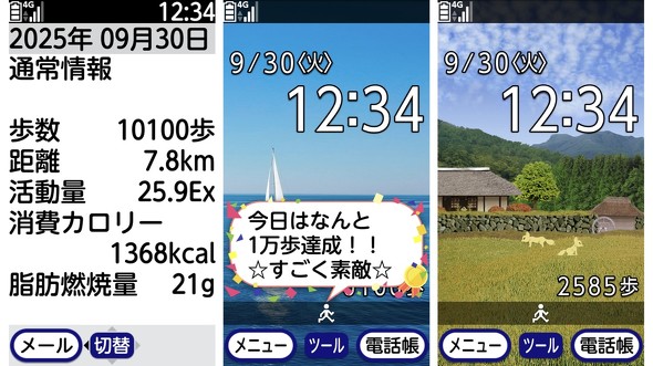 内蔵の歩数計では、楽しく散歩を継続できるよう、歩数によって応援メッセージを壁紙に表示してくれる。