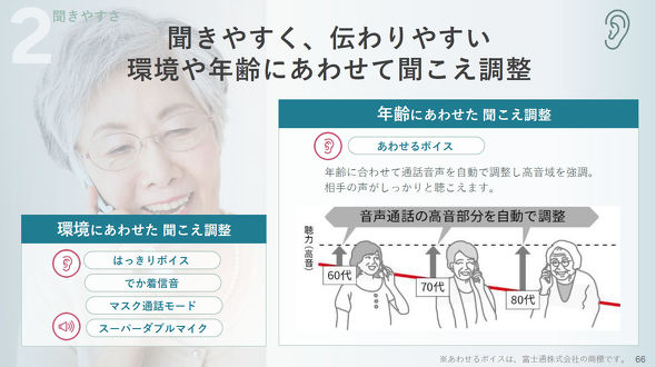 聞きやすさについては、周囲の環境に応じて通話相手の声を聞き取りやすくする「はっきりボイス」、年齢に合わせて通話相手の音声を自動で調整して高音を聞き取りやすくする「あわせるボイス」を用意する。
