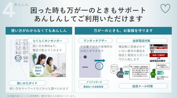 あんしんについては、迷惑電話や迷惑メールを判別する機能を用意する。ワンタッチでらくらくホンセンターのオペレーターに発信して使い方を相談できる「使い方」ボタンも備えている。