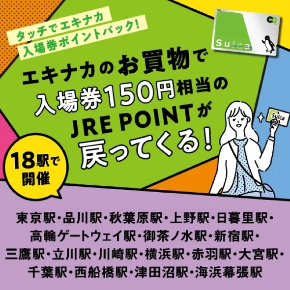 期間限定ポイントで利用できるサービスの変更に合わせて「タッチでエキナカ 入場券ポイントバック!」の対象となる「入場したSuicaで改札内対象店舗でのお買いもの」の金額を1000円以上から500円(税込み)以上に変更。付与されるポイントは通常ポイントから期間限定ポイント(付与した月の3カ月後の月末まで)となる。