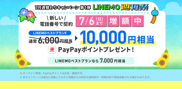 7月の第1弾では、新しい電話番号でLINEMOに契約すると、還元するPayPayポイントを増額。LINEベストプランだと3000ポイントから7000ポイントに、LINEMOベストプランVだと6000ポイントから1万ポイントに増額する。期間は7月6日まで。
