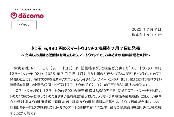 NTTドコモは7月7日、6980円(税込み、以下同)という手頃な価格ながら多機能なスマートウォッチ「スマートウォッチ01」「スマートウォッチ02」の2機種を発売した。全国のドコモショップおよびドコモオンラインショップで販売する。