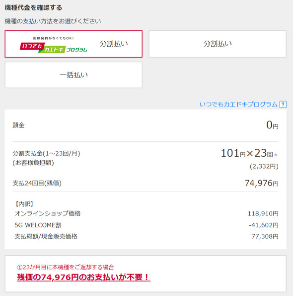 NTTドコモは、ドコモオンラインショップで「iPhone 15(128GB)」を安価で販売中。MNPで申し込み「5G WELCOME割」と端末の返却などの条件を満たすと残債が免除される「いつでもカエドキプログラム」の適用で、通常11万8910円(税込み、以下同)のところ2年間2332円で購入できる。