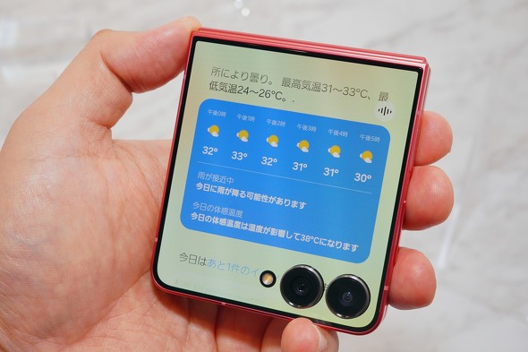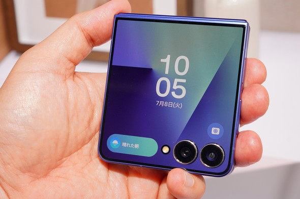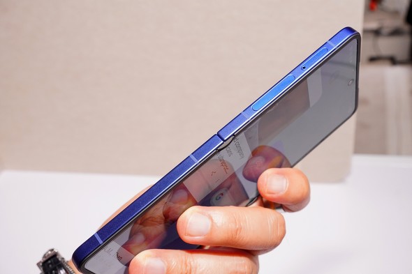 より大きく進化しているのは、閉じたときのカバーディスプレイだ。こちらのサイズは3.4型から4.1型へと大型化しており、表示部分がカメラを回り込むように拡大している。カバーディスプレイのベゼルは1.25mmと細くなった。これにより、本体を閉じたときの見た目が大きく変わっている。