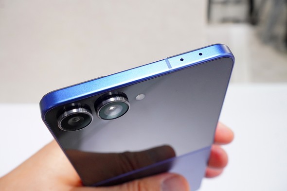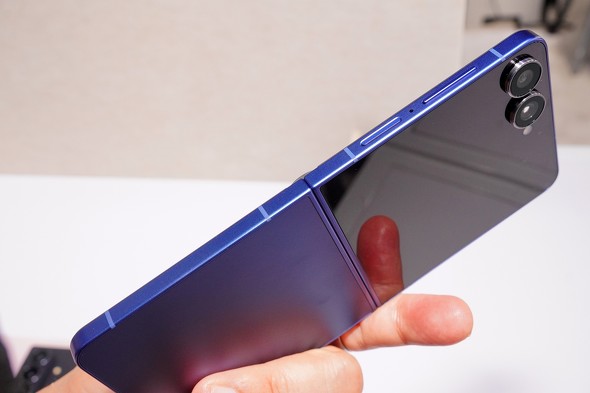 26%もの大胆な薄型化を果たした横折り型の「Galaxy Z Fold7」と同様、Galaxy Z Flip7もヒンジを刷新し、厚みをそぎ落としている。ただし、Galaxy Z Fold7と比較すると、薄さの印象はやや薄まる。先代モデル「Galaxy Z Flip6」との比較では、閉じたときの厚さが14.9mmから13.7mmに、開いたときの厚みが6.9mmから6.5mmへとダウンサイジングされた。