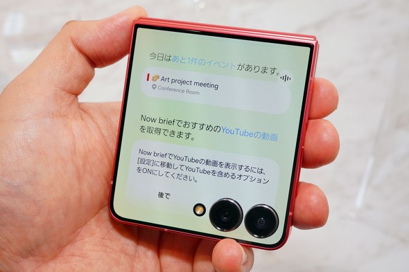 閉じたままでも、Galaxy AIやGeminiとのやりとりを、よりスムーズにできるというのがその特徴。カバーディスプレイには、一部アプリなどの進行状況を示す「Now Bar」を表示できる他、Geminiを呼び出し、音声で必要な情報を聞くこともできる。時間や場所に応じて必要な情報をまとめるGalaxy AIの「Now Briefing」も、カバーディスプレイに対応する。屋外でも使いやすいよう、最大輝度は2600ニトまで向上している。