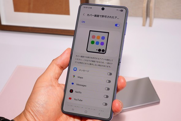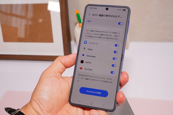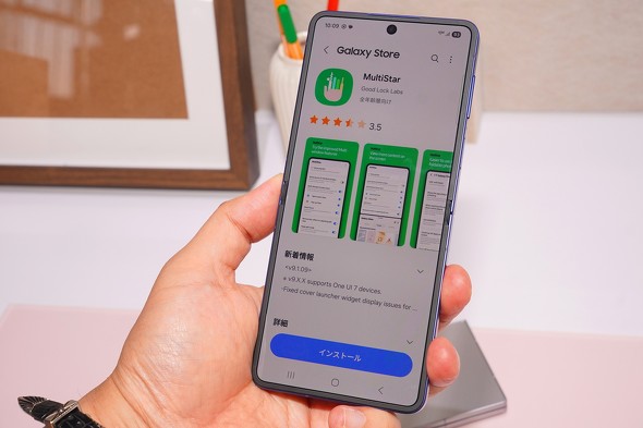 大画面化したカバーディスプレイだが、表示できるのはウィジェットと一部アプリという点は変わっていない。ただし、従来モデルから「Good Lock」というカスタマイズアプリを使うことで、その他のアプリも配置できた。Galaxy Z Flip7では、設定画面にこのツールへのリンクが張られており、Galaxy Storeに飛べる仕様になっていた。