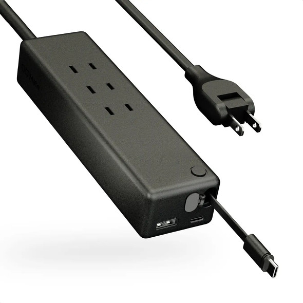本製品はボタンを押すとUSB Type-Cコネクターが飛び出し、約70cmのケーブルを引き出してスマートフォンを充電可能。電源タップ部は合計1400W出力に対応した3口のコンセントを備え、USB充電器部はコードリール式を含めUSB Type-C×2、USB Type-A×1を搭載している。電源ケーブルは長さ1.5m。