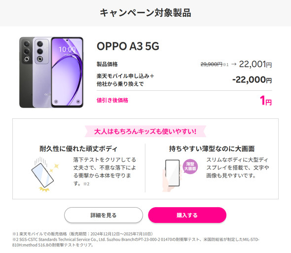 楽天モバイルは、7月11日に楽天モバイルショップ、楽天モバイル公式サイト、楽天モバイル公式 楽天市場店で販売している「OPPO A3 5G」の価格を2万9900円から2万2001円(税込み、以下同)に改定した。