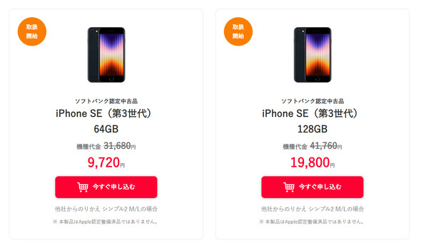 ソフトバンクは、7月17日にY!mobileで取り扱っている認定中古iPhoneへ「iPhone SE(第3世代)」を追加した。64GBモデルは3万1680円(税込み、以下同)、128GBモデルは4万1760円。