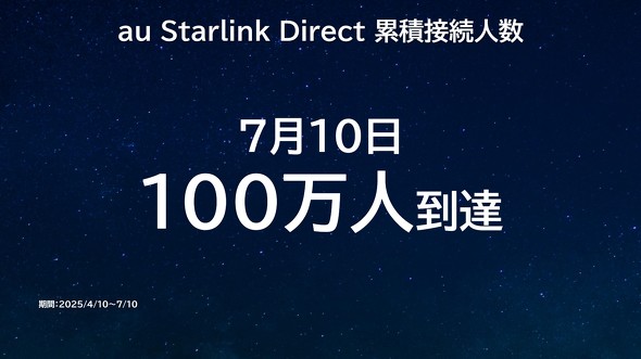 KDDIの衛星通信サービス「au Starlink Direct」が大幅な品質向上を実現した。7月17日に同社が開催した体験会で明らかになったのは、SMS送受信時間が従来の2分以内から30秒以内へと4倍高速化したことだ。2025年4月10日のサービス開始から約3カ月で、累計接続者数は100万人を突破した。