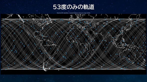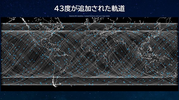 軌道傾斜角とは、衛星の軌道面が赤道面に対して傾いている角度を指す。従来は赤道から53度傾いた軌道のみで運用していたが、既に周回していた43度軌道の衛星約300基が日本向けに電波を発射開始した。全体で約600基体制となり、日本上空の衛星密度が大幅に向上した。