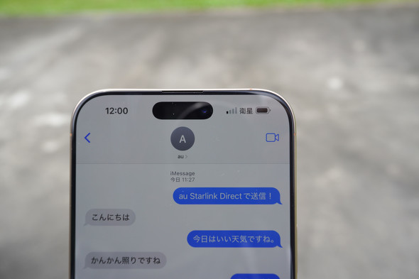 ステージのような開けた場所でiPhone 16 ProとGalaxy S25 Ultraを使って体験した。すでに圏外表示になっていた端末は、すぐに画面上部のピクトが「衛星」マークに切り替わった。キャリア表示も「Starlink-au」に変わる。この状態では通話やデータ通信はできないが、SMSとiMessage(iOSのみ)、RCS(Androidのみ)が使える。