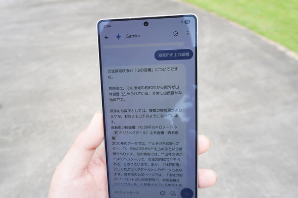 AndroidのRCSでは、GoogleのGemini AIとチャットできる。「高萩市の山林の面積は?」という質問を投げかけると、統計データをもとに推論した詳細な回答が返ってきた。より高度な質問にも対応できる印象だ。