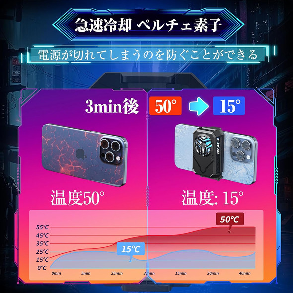 本製品はペルチェ素子を採用し、回転速度6000rpmのファンが約3分で端末温度を約50度から15度まで下げるという冷却ファン。騒音値は30dB前後でゲームプレイや動画視聴に干渉せず、1300mAhのバッテリー搭載で約90分間は屋外など場所を選ばず利用できる。