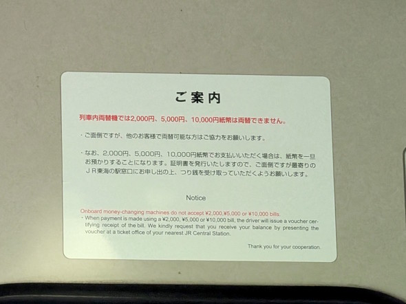 JR東海 ワンマン列車で運賃をお支払いいただく際に、高額紙幣をご利用の場合にお客さまにご不便をおかけするケースがあることがございます。具体的には、当社におけるワンマン列車では車内の両替機が高額紙幣に非対応であり、高額紙幣をお持ちのお客さまに対しては、お客さまから一時的に高額紙幣をお預かりして証明書を発行し、後で駅にて差額の払い戻しを行う「概算収受」という取り扱いを行っています。